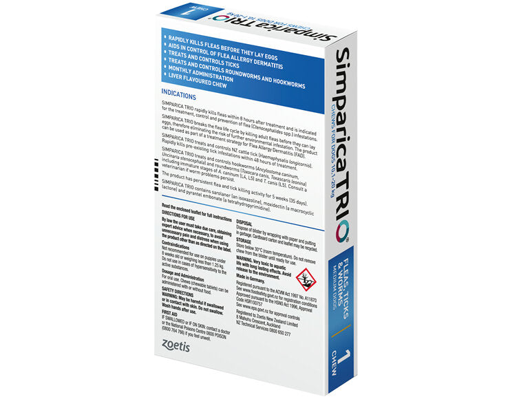 Simparica Trio is a tasty, chewable monthly treat that dogs love to eat, with or without food, that protects against fleas, ticks and worms. Being a tasty chew, dogs can go swimming or be bathed before and after administration.