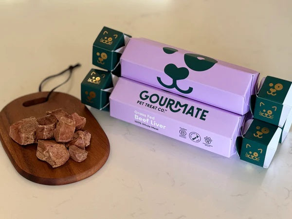 Each cracker contains 15g of Gourmate Pet Treat Co. Grass Fed Beef Liver dog treats. The cardboard cracker and soft plastic internal bag are both recyclable in New Zealand.